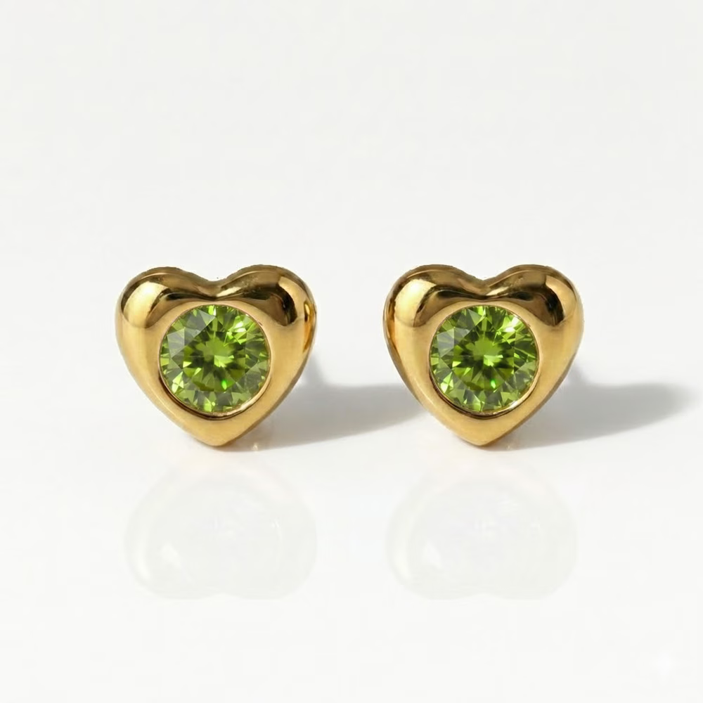The 24K Gold Plated HeartLite Peridot ear piercing stud presents a refined heart silhouette accented with a Swarovski Peridot stone.